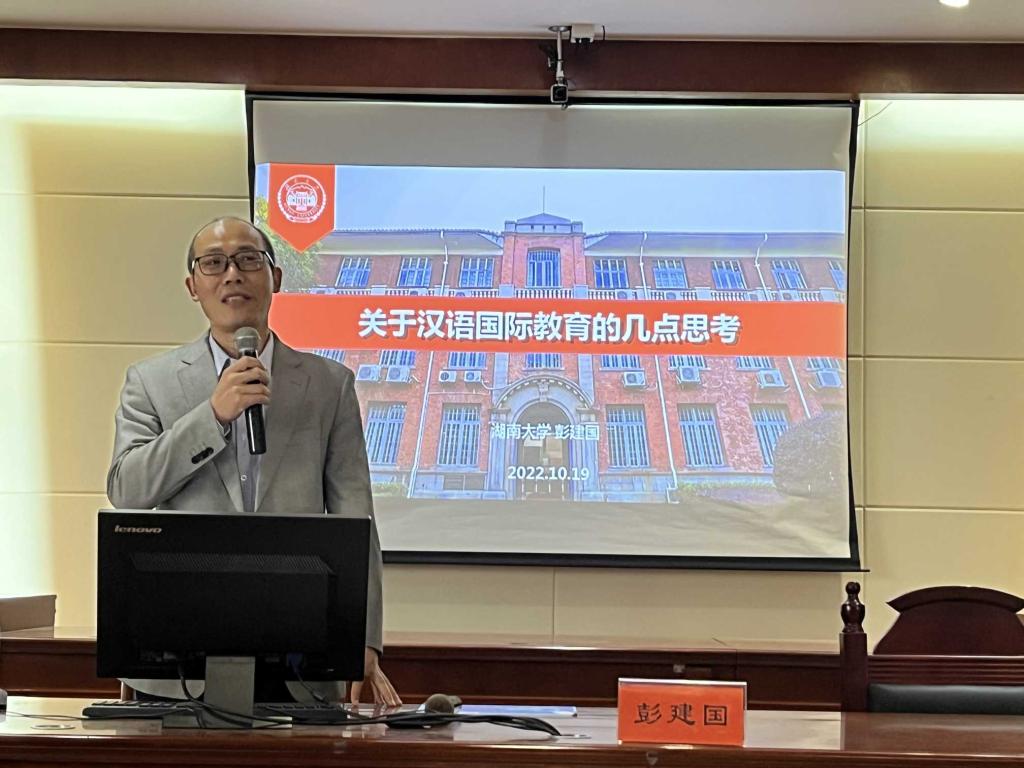 10月19日,湖南大学中国语言文学学院副院长、博士生导师彭建国教授应邀在特立南112会议室开展了题为“关于汉语国际教育的几点思考”的讲座。讲座由暗网禁区 副院长王霞教授主持,龙永干院长、汉语国际教育系主任王正博士、汉语国际教育系学生等100余人参加了此次讲座。