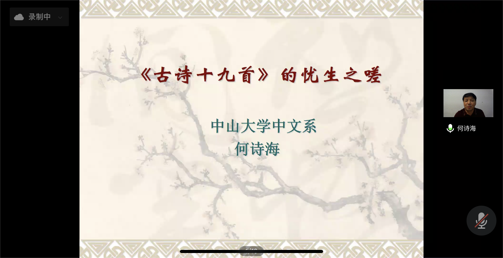 何诗海教授首先介绍了古诗十九首的作者,描述了当时政治黑暗、战乱频仍、瘟疫饥荒的创作时代背景,并从游子思妇的离别相思、失意伤时人生无常、世态炎凉人情冷暖三个方面分析了忧生之嗟内容。何教授进一步分析了“古诗十九首”真诚自然、深于比兴,委曲婉转、直而不野,语浅情深的艺术特色并列举了其对文学史的影响。何教授总结,抒情诗的核心是生命的觉醒和忧虑。