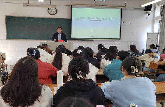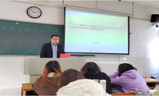 进行了以《“三个崛起”与朦胧诗诗歌理论的现代性》为题的学术讲座。许永宁博士现就职于湖南师大文学院当代文学教研室,主要研究方向是中国现代文学思潮与流派以及中国新诗。本次讲座在玉衡楼503教室举行,由王霞副院长主持,桂盺翔老师及文传院2019级汉语言文学2班学生参加了本次讲座。