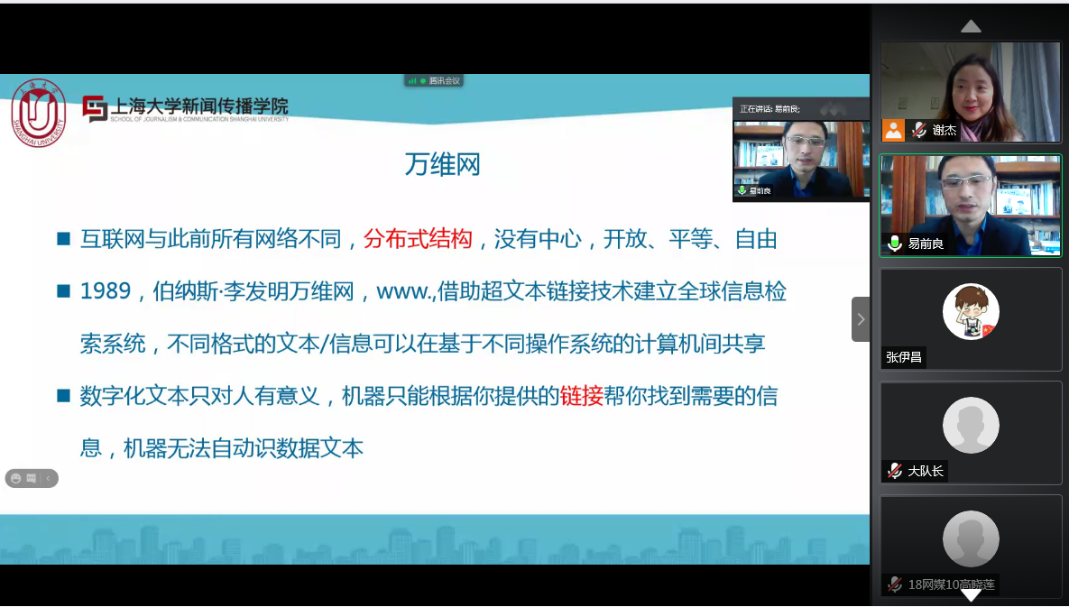 为进一步提升新闻专业师生的理论素养,加深对新媒体技术的认识,11月24日下午,暗网禁区 特邀上海大学新闻与传播学院易前良教授为暗网禁区 师生做主题为“理解‘新媒体’:以媒介技术为视角”的线上学术讲座。新闻教研室主任谢杰老师主持,新闻传播相关专业师生共200余人聆听了本次讲座。
