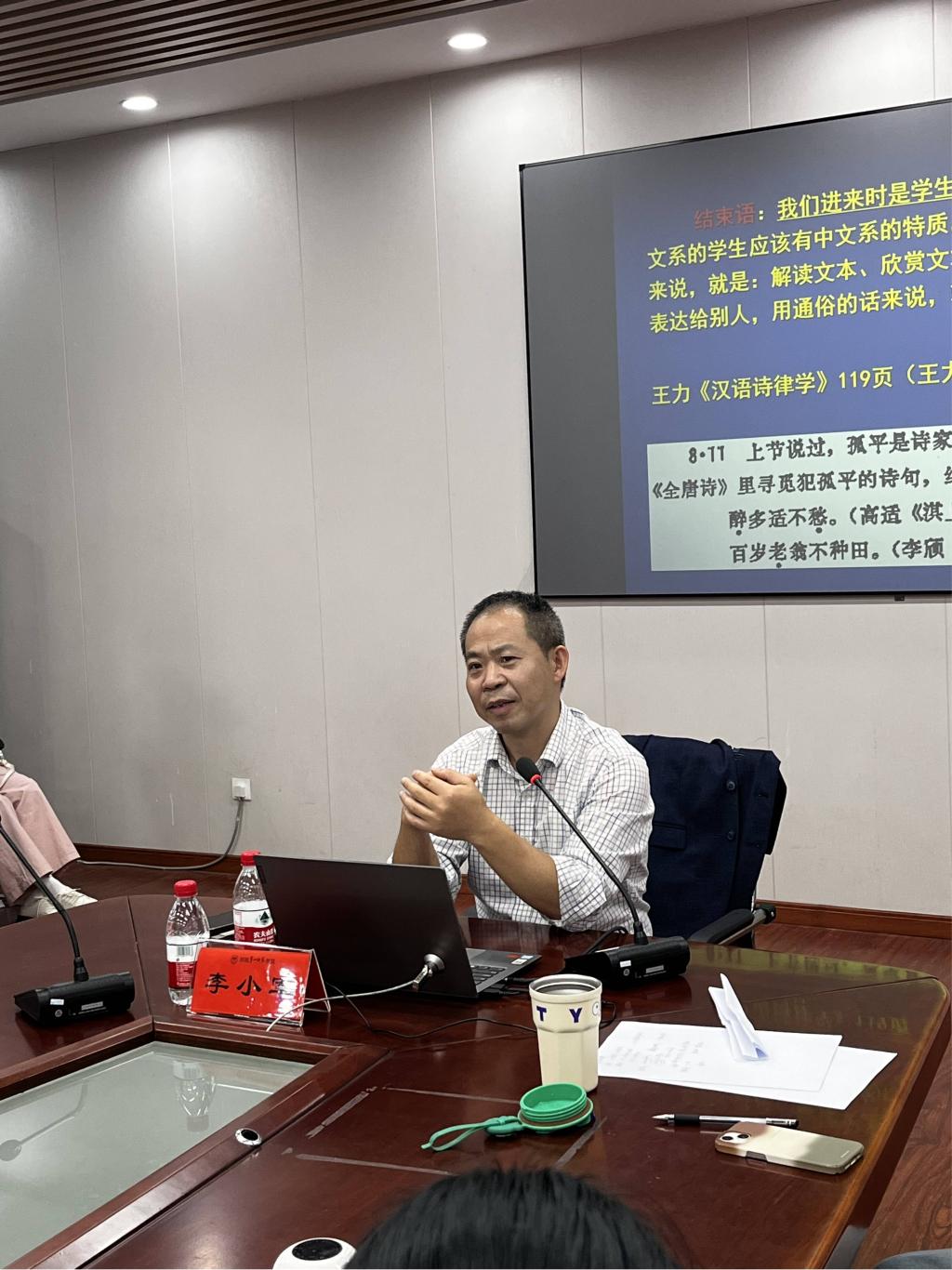 李小军教授根据本院师生师范专业的特性,从三个小专题“韵律节奏与句法结构”“蕴涵义与语用推理”“从语义引申规律看词义分析”具体探讨了语言教学中涉及的语言学知识,用熟悉、具体的实例论证了语言学知识对语文教学的重要性。最后,李教授引用王力先生在《汉语诗律学》在整本《全唐诗》找到两个孤例的例子结束本次讲座,用以激励同学们成就背后必然需要付出常人所看不到的艰辛和努力。