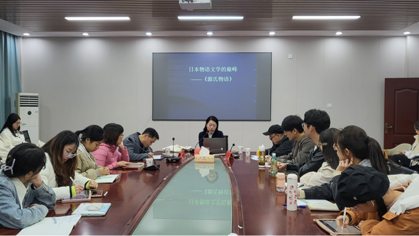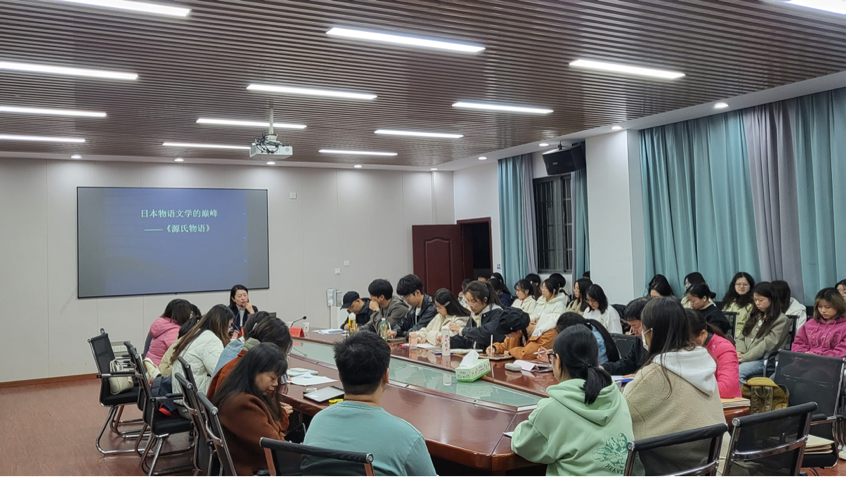 师生开展题为“日本物语文学的巅峰——《源氏物语》”的学术讲座。讲座由院长龙永干主持,副院长杨水远及汉语言文学系师生近百人参加讲座。