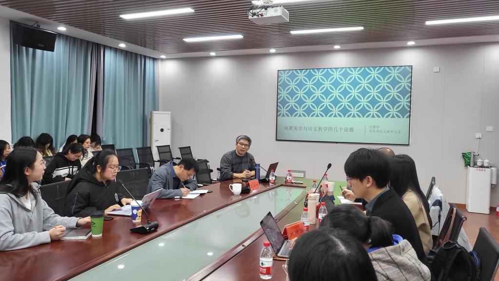特邀华东师范大学中文系副主任、博士生导师汤拥华教授来院作题为“风景美学与语文教学的几个论题”的学术讲座。讲座由院长龙永干教授主持,副院长杨水远、湖南师范大学文艺学教研室副教授王健老师及80余名师生参加讲座。