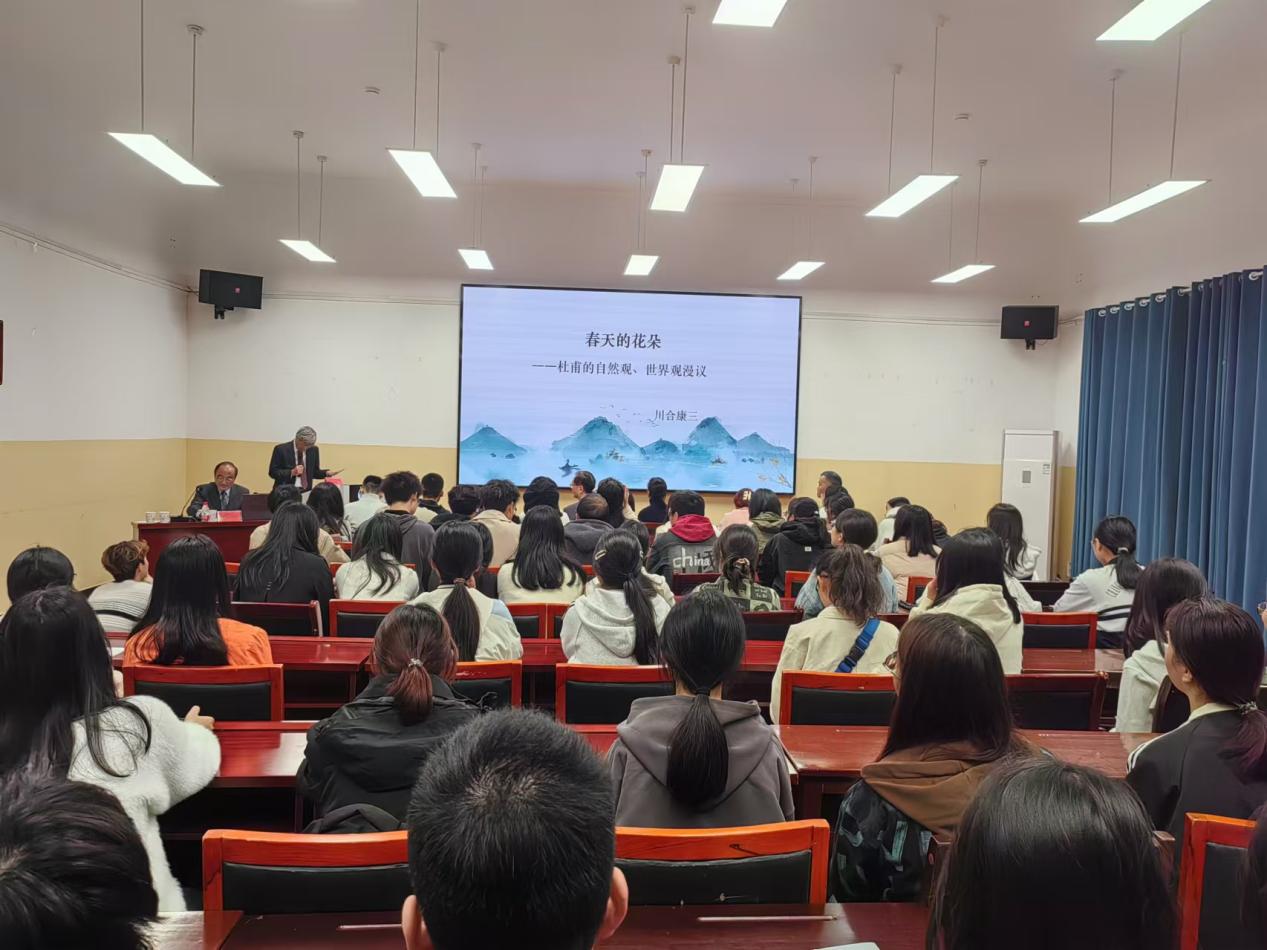 师生做题为“春天的花朵——杜甫的自然观、世界观漫谈”学术讲座。湖南师范大学文学院杨合林教授,湖南师范大学国际汉语文化学院张红教授,副院长杨水远,汉语言文学系老师及24级汉语言文学专业学生100余人参加讲座。讲座由副院长杨水远主持,日本南山大学名誉教授蔡毅担任现场翻译。