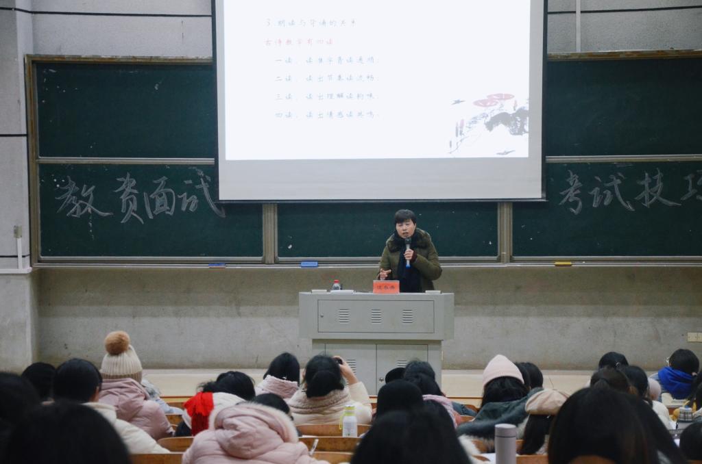 学生做了“小学语文古诗词教学”的专题讲座。副院长葛春蕃主持,2018级全体师范生聆听了本次讲座。