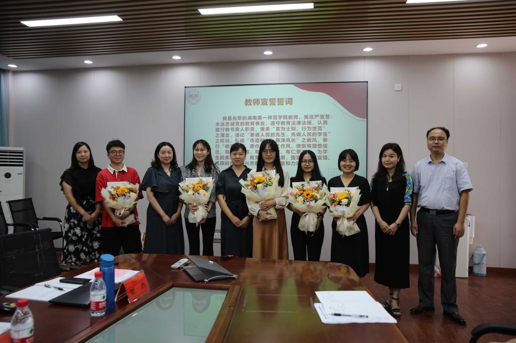 新进教师入职宣誓仪式由院党委副书记李豪杰主持。李书记首先代表学院致欢迎辞,并介绍7位新进教师的基本情况,宣布教师所属系室及系室情况。院长龙永干代表学院向各位新进教师表达了热烈的祝贺,并对新进教师提出了三点要求,一是要尽快完成从学生向教师角色、从批判者向建构者的角色转换、从理论者向实践者的转换,二是要尽快了解学校、学院、专业、学科和并做好个人职业规划,三是要珍惜岗位。会上,由副院长杨清华领誓、院长龙永干监誓,带领新进教师进行集体宣誓,表达对教师这一神圣职业的热爱和承诺,传递积极向上的正能量,传承新时代人民教师精神风貌。在宣誓仪式结束后,学院党委书记何培森也对新进教师提出了讲政治、守规矩、珍惜岗位和敬畏讲台的四点要求,同时希望增添了新力量的文传院变得越来越好,希望老师们牢记习近平总书记嘱托,努力成为新时代“四有”好老师。