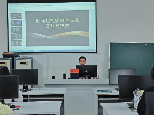 师生开展题为“新闻短视频内容选择及账号运营”的讲座,讲座由副院长杨水远主持,网络与新媒体系主任谢亚可、广播电视学系主任罗卫光及网络与新媒体学生参与本次讲座。