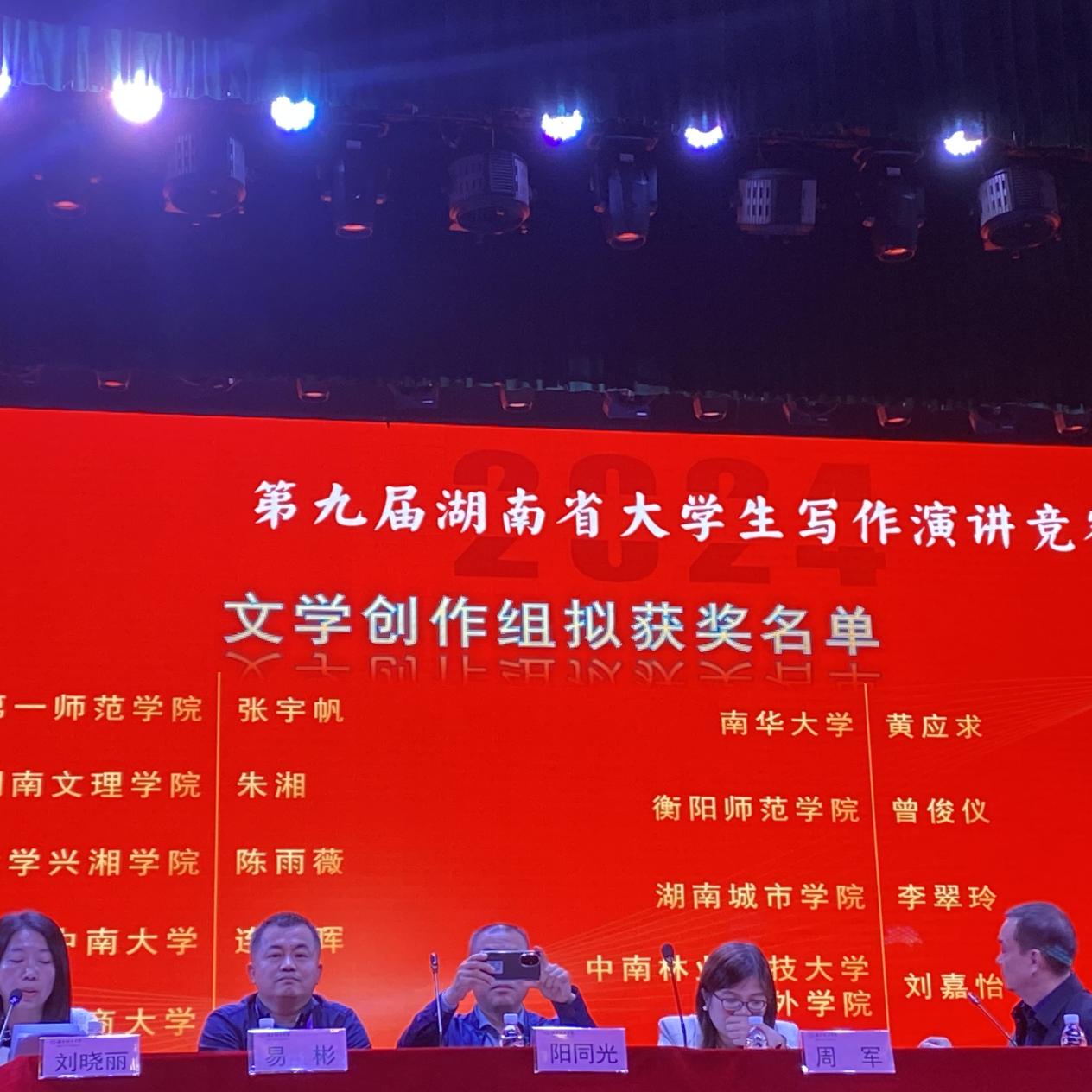 2024级中文4班张宇帆荣获文学创作组一等奖第一名,2023级中文4班张杨荣获文学创作组二等奖,2022级中文润之班马芳荣获文学创作组三等奖,2023级中文润之班蔡佳妮和2022级900中文班陶利平荣获文学评论组二等奖,2023级中文2班戴张凯荣获演讲组二等奖。
