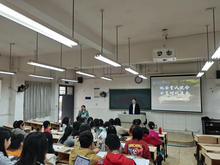 “国家繁荣、民族振兴、教育发展需要一支师德高尚、业务精湛、结构合理、充满活力的高素质专业化教师队伍,需要涌现一大批好老师。”此次讲座以习近平总书记在同北京师范大学师生代表座谈时的讲话为切入点,阐明教师是教育工作的中坚力量。湖南师大附中凌云中学党支部书记陈光辉多年来扎根教育一线,心中满怀教育热情,他结合亲身经历从教师职业的四种境界、教育的本质、怎样成为一名好老师三个方面为同学们阐释了教师担当育人使命的重要性。