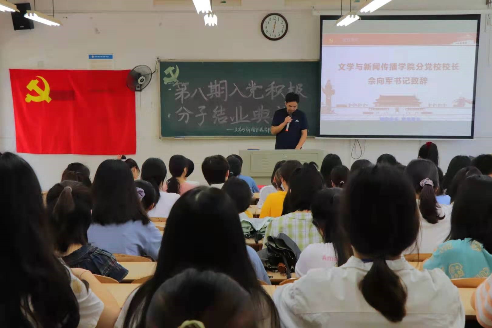 分党校校长佘向军书记致辞,书记对顺利通过结业考试的入党积极分子表示了热烈的祝贺,同时也对他们提出了新的要求:希望在座的入党积极分子能够以一名合格党员的标准来要求自己,主动学习党的知识,提高党性修养。紧接着,唐科老师向大家宣读了此次培训的优秀学员名单。随后,优秀学员代表2019级796中文班彭海英同学上台发言,表示将以身边的优秀共产党员为榜样鞭策自己,以党员的标准严格要求自己;会以更加饱满的热情投身到党的各项事业中去,为党的事业奋斗终身。最后,佘向军书记、欧阳范剑副书记给优秀学员颁发证书并合影留念。