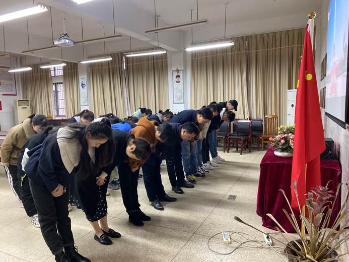 随后,佘向军书记带领大家进行了党史学习,讲述了中国共产党带领革命先辈和无数仁人志士,建立新中国、走进新时代的光辉历程。佘书记特别强调,作为中国革命的“红色摇篮”,第一师范不但走出了毛泽东、蔡和森、何叔衡、任弼时、李维汉等无产阶级革命家,还涌现了毛泽民、毛泽覃、杨开慧、段德昌、刘畴西、郭亮等一大批为民族解放和独立而献出生命的革命烈士。我们要学习他们坚持真理、敢于牺牲的精神,为中华民族的伟大复兴做出应有的贡献。学院党总支副书记欧阳范剑表示,清明祭英烈是学习党史、坚定理想信念,传承红色精神的重要方式,希望全体师生学习革命先辈的英雄事迹,不断感悟革命先辈全心全意为人民,不惧生死、艰苦奋斗的宝贵精神,并以实际行动传承先烈精神,强化使命担当意识。