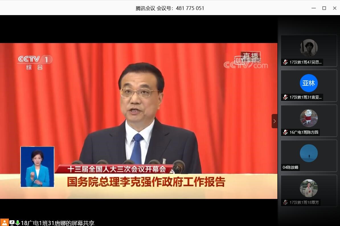 学生第一党支部在腾讯会议上开展以“走进人大会场,倾听时代心声”为主题的党日活动,组织学生第一党支部全体学生党员及入党积极分子在线上观看学习《十三届全国人大三次会议开幕会》。
