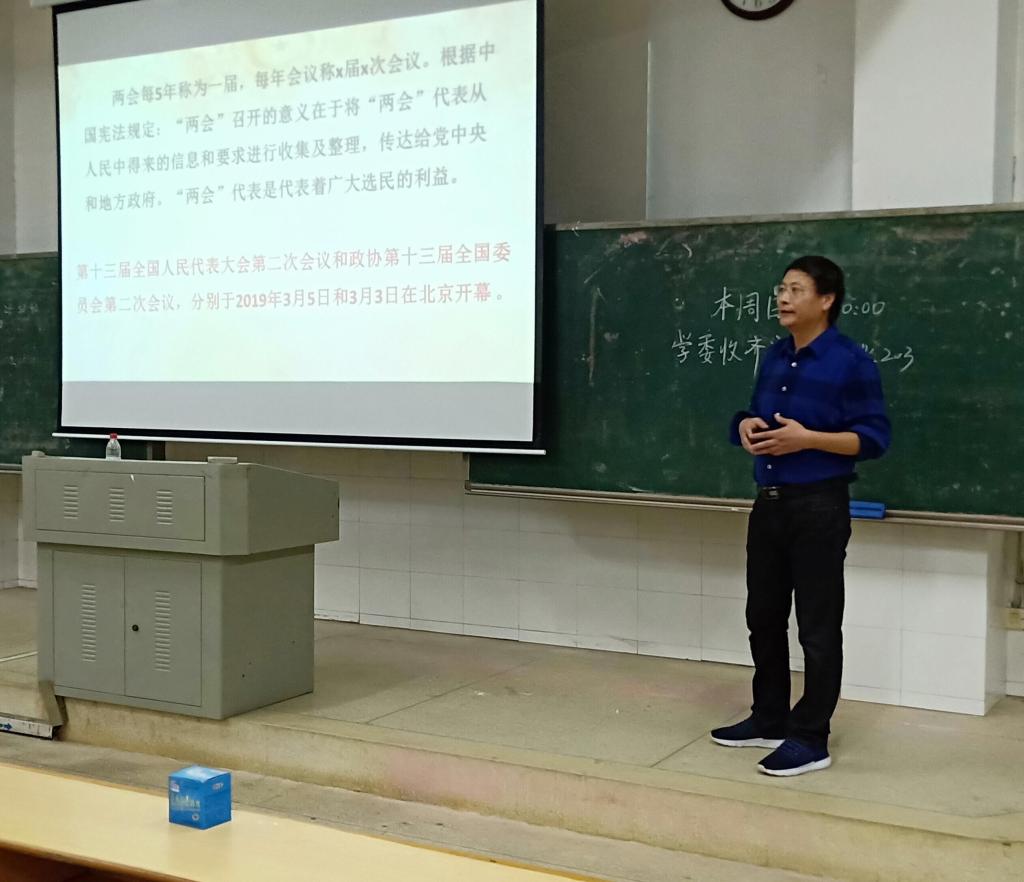 学生党支部于2019年4月26日晚7点至8点于玉衡南101教室开展了“学习两会精神” 党课。此次党课由党总支部书记刘澍心教授主讲。