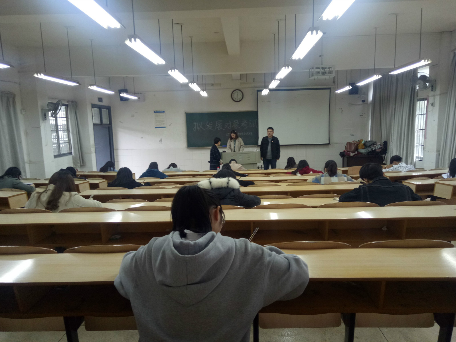 在玉衡楼206举行党性知识考试, 24名拟发展对象参加了考试。学生党支部第一支部书记罗燕老师和第二支部书记闫伟老师监考。
