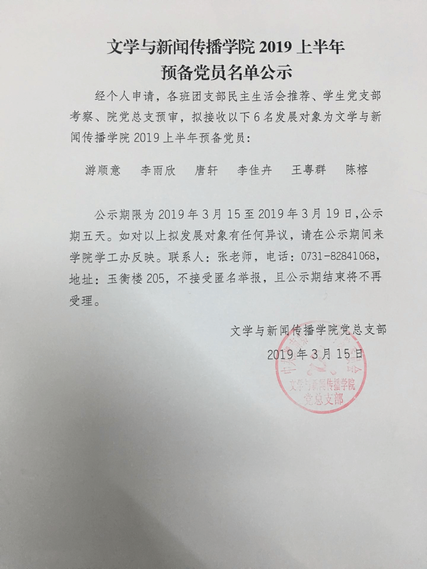 公示期限为2019年3月15至2019年3月19日,公示期五天。如对以上拟发展对象有任何异议,请在公示期间来学院学工办反映。联系人:张老师,电话:0731-82841068,地址:玉衡楼205,不接受匿名举报,且公示期结束将不再受理。