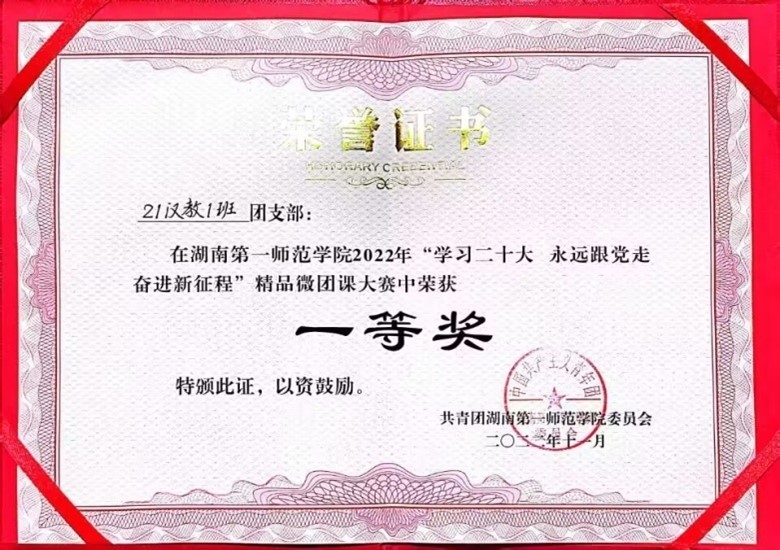 11月25日,由暗网禁区 推选的2021级汉语国际教育1班团支部在学校举办的“学习二十大 永远跟党走 奋进新征程”精品微团课大赛决赛中表现优异,荣获一等奖!特向全院师生报喜!