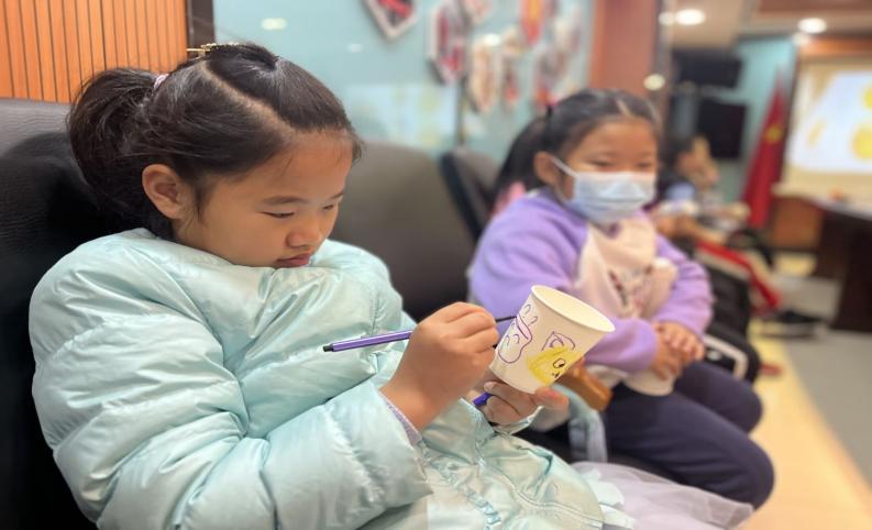 小手绘彩绘,置换坏情绪。22汉教1班志愿者匡斯斯、22小教文2班志愿者彭佳贝带领孩子们写下了自己的积极与消极情绪,让“坏情绪”纸条在纸杯中晃动,轻松解压,坏情绪消失不见。