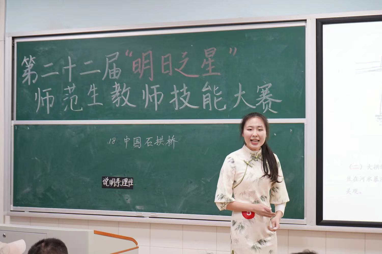 参天大树,始于毫末;巍峨九层之台,起于垒土。经过学院初赛的激烈选拔,中学组6位选手、小学组14位选手脱颖而出进入决赛。决赛中,选手们在教学设计、片段教学、课件制作、教师语言、教态、板书等多个方面进行了全面的展示。肖睿一饱含情感地课文《青山处处埋忠骨》朗读示范,让在场师生无不深刻体会到一代伟人的凡人的情怀和不同凡人的胸襟;张佳雯借助精美的图片让学生对赵州桥的特点有了更为直观的认识;朱聪将《白鹭》“摇身一变”成一首诗,使其讲解更为生动和形象……选手们语言规范流畅、表现自然亲切,板书线条流畅、工整隽秀,现代教育技术与传统教学方式无缝衔接,用自己的才华和激情征服了现场观众和评委老师们。
