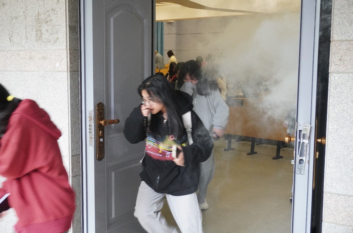 演习开始前,来自康安消防的周洋教官讲解了引发火灾事故的常见安全隐患、火灾中对人的生命健康和财产造成影响的主要源头以及火灾疏散逃生中的注意事项。随后,周洋老师为大家详细讲解灭火器的正确使用方法和防毒面罩的操作要领,并亲自示范。下午 13时,随着急促的火警警报铃声响起,滚滚浓烟从润寰南101弥漫开来,学生们捂住口鼻,弯腰低姿,在安全员的指引下按照预定的疏散路线从寝室的安全出口有序、安全地撤离至国基广场的空旷地带。