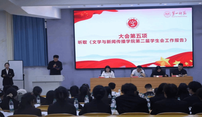 第二届学生会执行主席邓宝彬代表第二届学生会作题为《厚德博学担使命,文以明道启新章,在服务文化强国建设中彰显文传学子的青春担当》的工作报告。报告指出,学生会聚焦思想引领、组织改革等六大领域体系化推进工作,在强化价值引导、激发组织活力、服务成长成才等方面成效显著,为学院高质量发展和学校“四个一师”建设注入澎湃青春动能。报告还就未来工作提出明确方向,强调将持续深化组织改革,拓展服务领域,强化桥梁纽带作用,引领广大同学在文化强国建设中贡献青春智慧与力量。