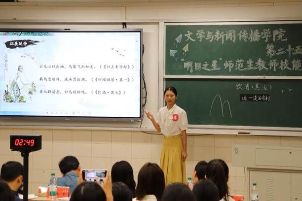 赛场上,选手们凭借精湛的教学设计,让经典文本在课堂中焕发新意、彰显深度。中学组戴张凯以“舞字破题”辅以四次情感咏叹,引导学生在鼓点与律动中感受《安塞腰鼓》的生命张力;潘思媛则围绕“远离与亲近”展开思辨解读,层层叩问《饮酒》背后的精神哲思。小学组蔡蕊从“月落乌啼”的画面铺陈与“愁眠”的心境剖析双线切入,让《枫桥夜泊》的羁旅愁思在课堂上悄然具象。整个赛程精彩纷呈,充分展现了文传学子扎实的学科素养与蓬勃的教学风采。