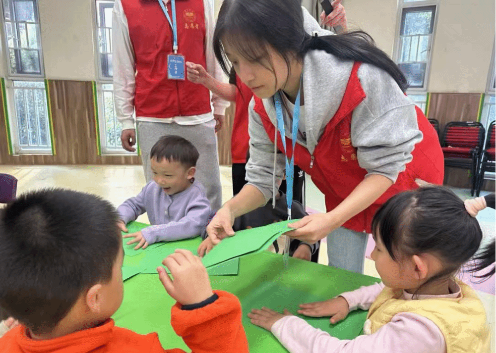手工桌上,彩色卡纸、白色皱纹纸、银色闪粉整齐摆放,志愿者手中的成品格外亮眼——翠绿树枝、金黄草地间,白皱纹纸碎片缀满角落,撒上闪粉如粼粼“霜花”。“先画树枝草地,再贴皱纹纸当霜花,最后撒闪粉。”志愿者耐心示范,孩子们动笔勾勒秋日场景,有人小心撕纸,有人专注涂胶。“老师,我的霜花好看吗?”五岁的婷婷举着作品,眼睛亮晶晶。志愿者撒上闪粉,作品瞬间晶莹,孩子们嘴角上扬,绽放出灿烂的笑。