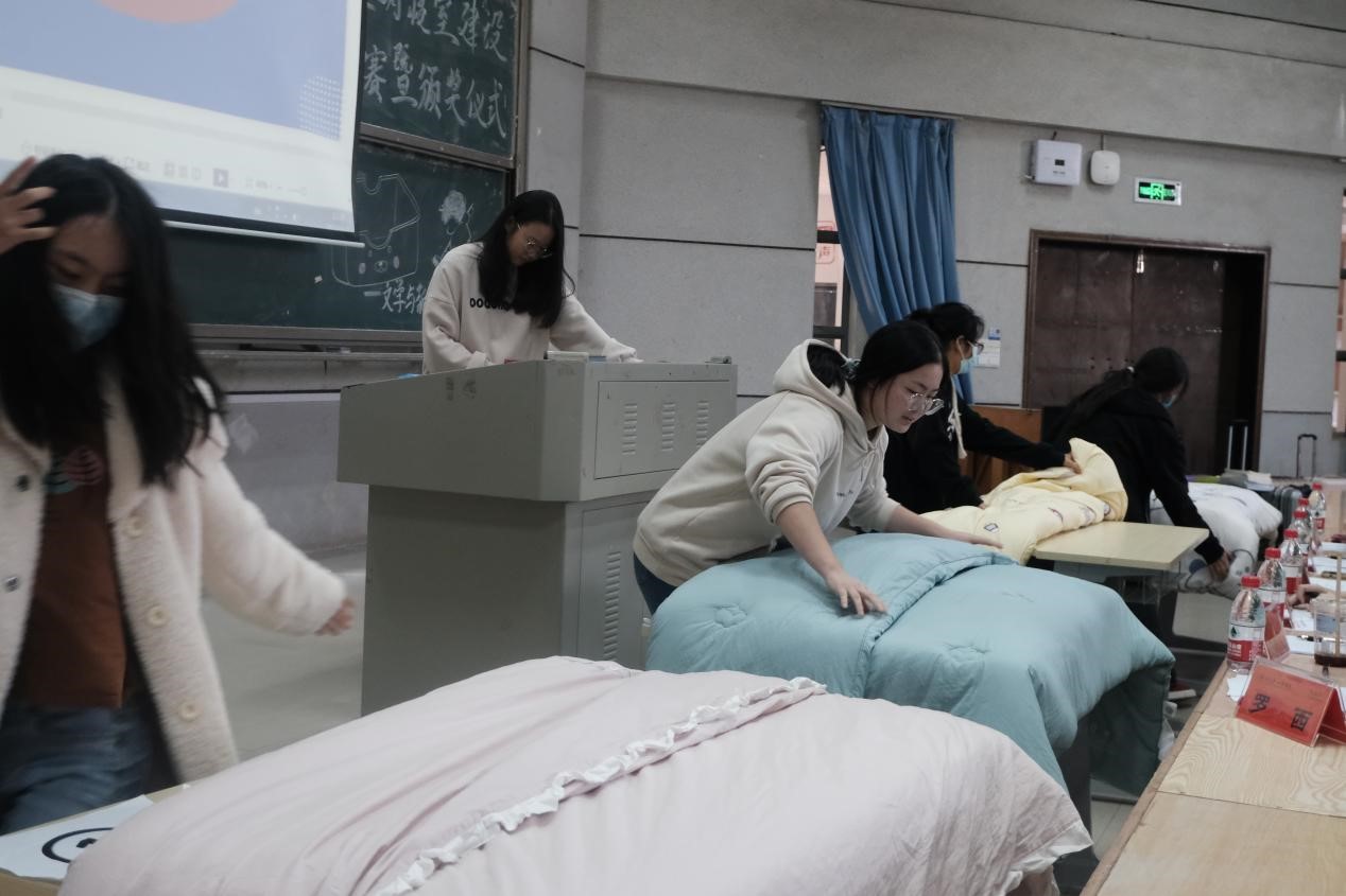 创新劳动教育模式,用大学生喜闻乐见的方式以赛促学,以赛促教,以赛促建。比赛分为个人赛和团体赛,个人赛限时1分钟叠被子,团体赛寝室四人限时1分15秒完成多样生活物品收纳整理,整齐有序者获胜。