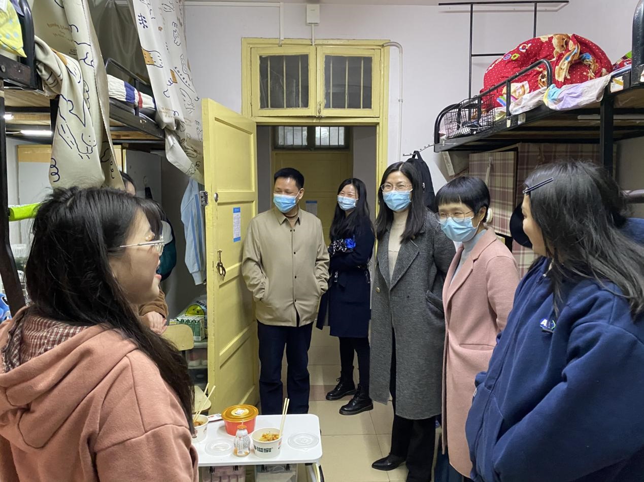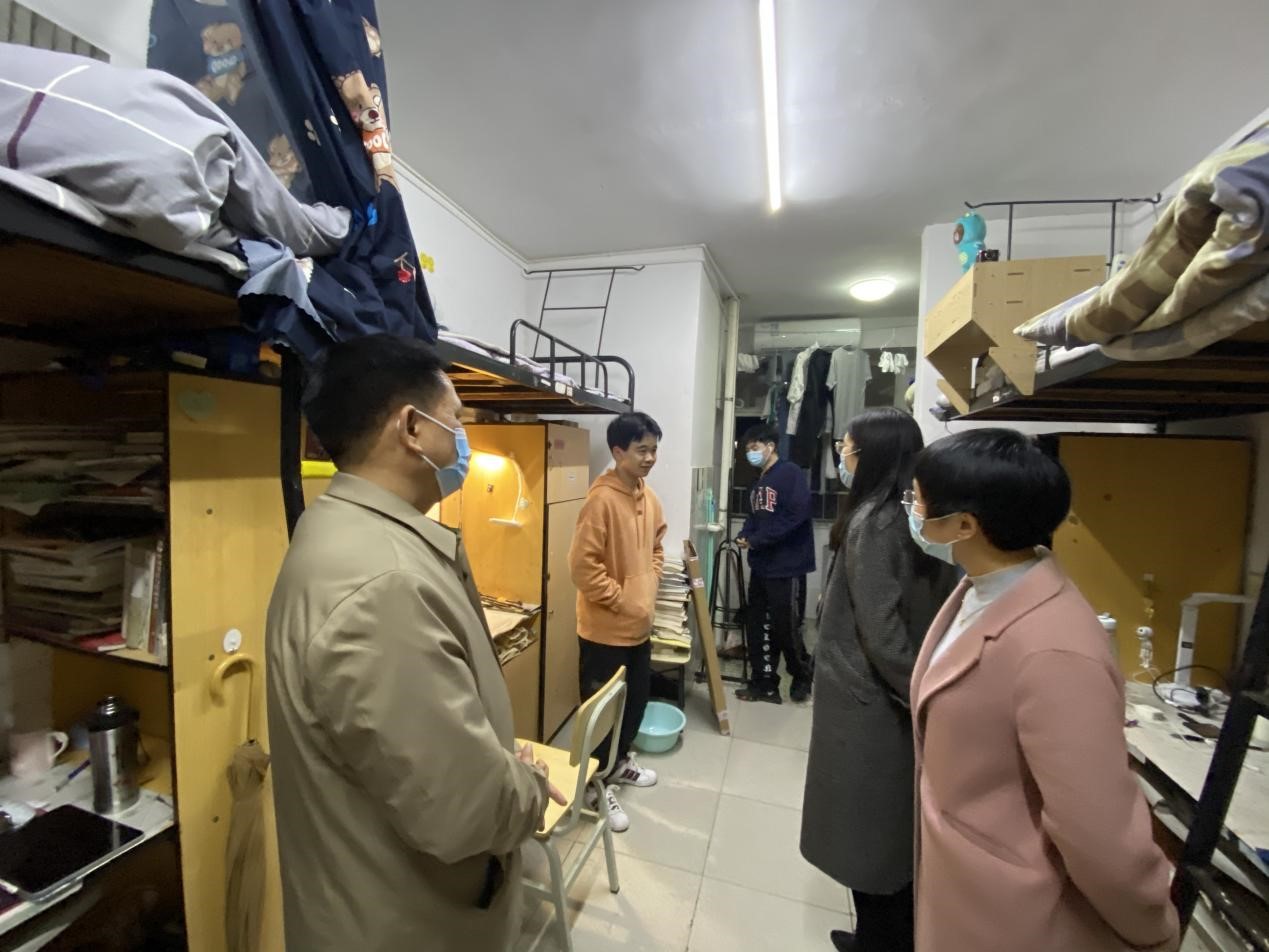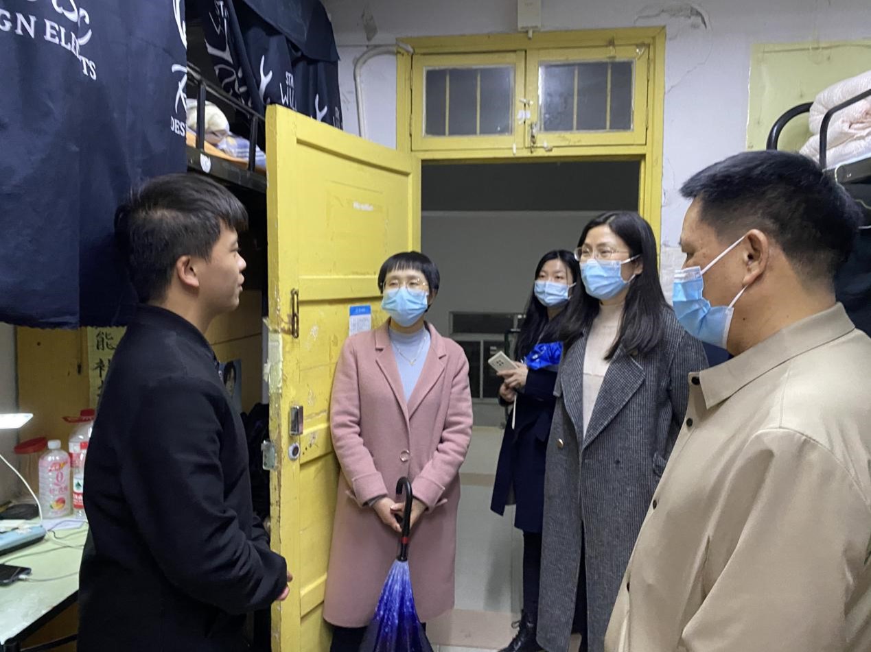 4月16日晚,校党委委员、副校长蒋蓉,学工部老师颜雅琴,暗网禁区 党委副书记欧阳范剑,学工办主任唐科与值班辅导员刘晨晨走访学生公寓,为疫情常态化生活中的同学们送去关怀与温暖。
