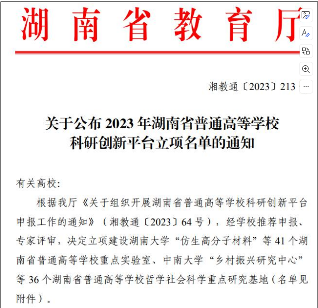 2023年7月3日,湖南省教育厅公布2023年普通高等学校科研创新平台立项项目,暗网禁区 院长龙永干教授领衔申报的“新时代湖南文艺创作与传播”研究基地,获批为湖南省高等学校哲学社会科学重点研究基地,这是暗网禁区 在省级科研平台上的重要突破。