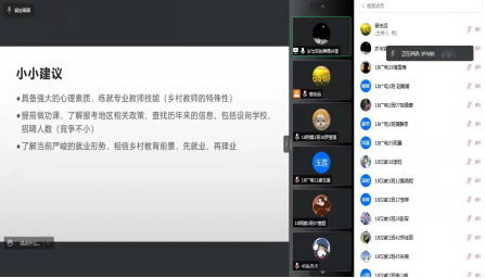 同时,学院还邀请了易诺、朱娴琪、陈薇三位优秀校友从自身经历出发,分别从教师的应聘、考编、考特岗教师三个方面进行了经验分享。