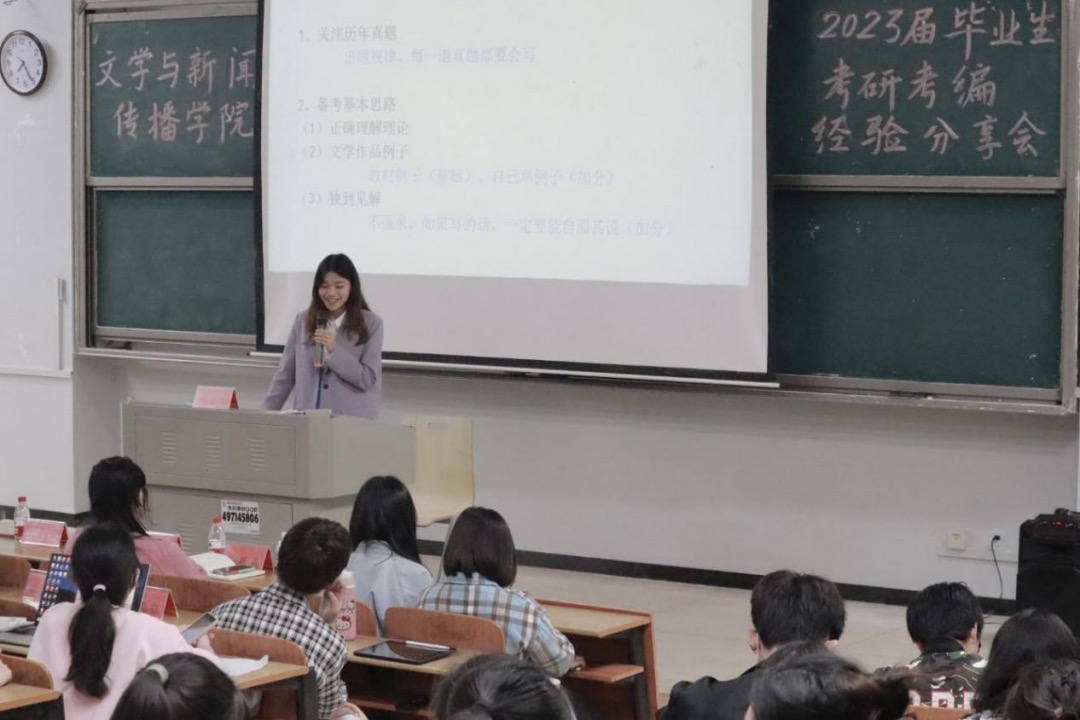 在怀中南209教室召开了2023届毕业生考研考编经验分享会。院长龙永干、副院长王霞、学工办副主任曾志远、辅导员刘晨晨,以及罗许诺、陈敏等8名19级学生代表及20级200多名学生参加了本次分享会。