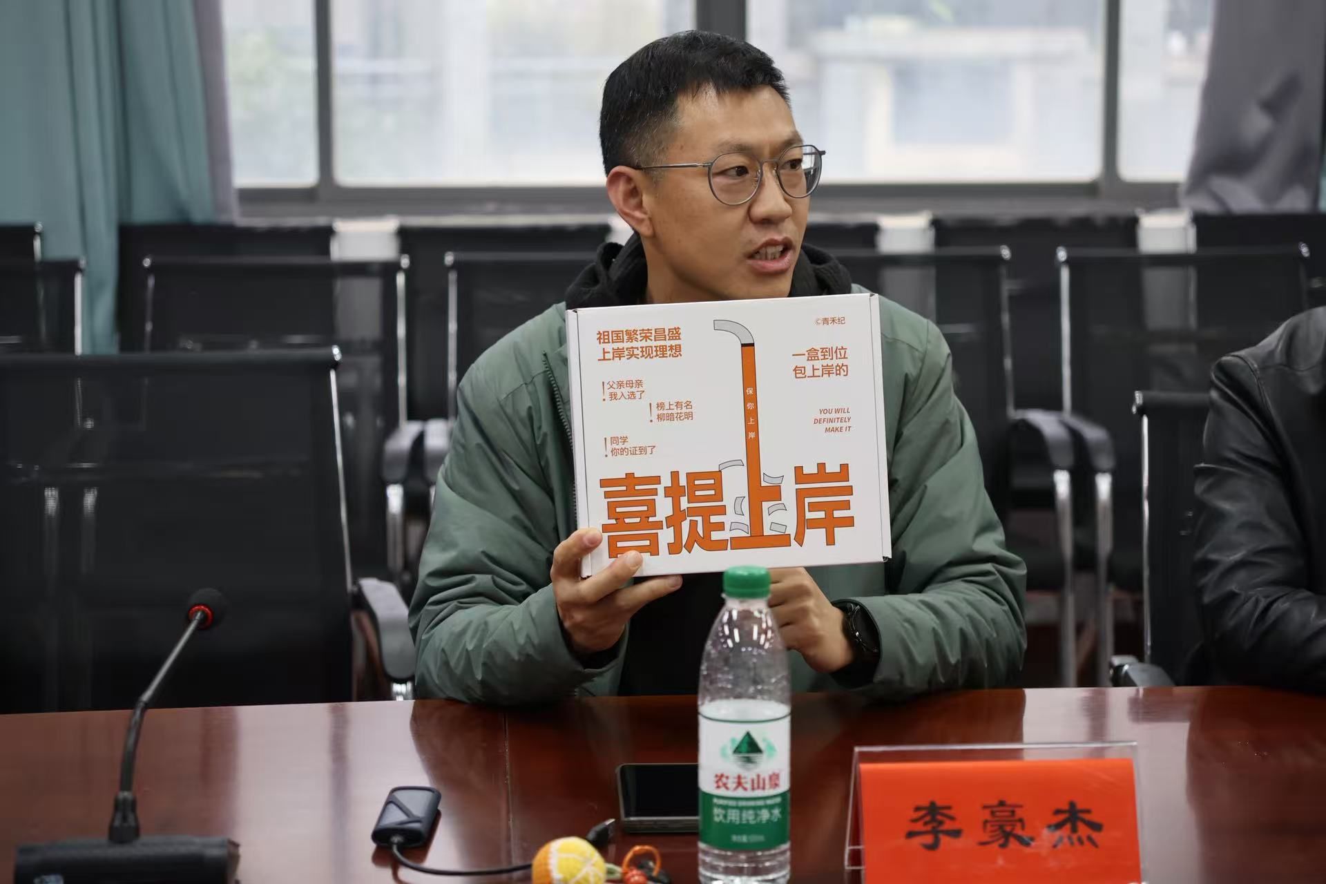 随后,李豪杰介绍了饱含学院关怀的考研礼包。礼包内含实用的学习用具,承载着学院对学子们“心想事成、成功上岸”的美好祝愿。在场领导共同向同学们发放了礼包。全体人员合影留念后,齐声喊出“上岸”的铿锵口号,为活动画上了圆满的句号。