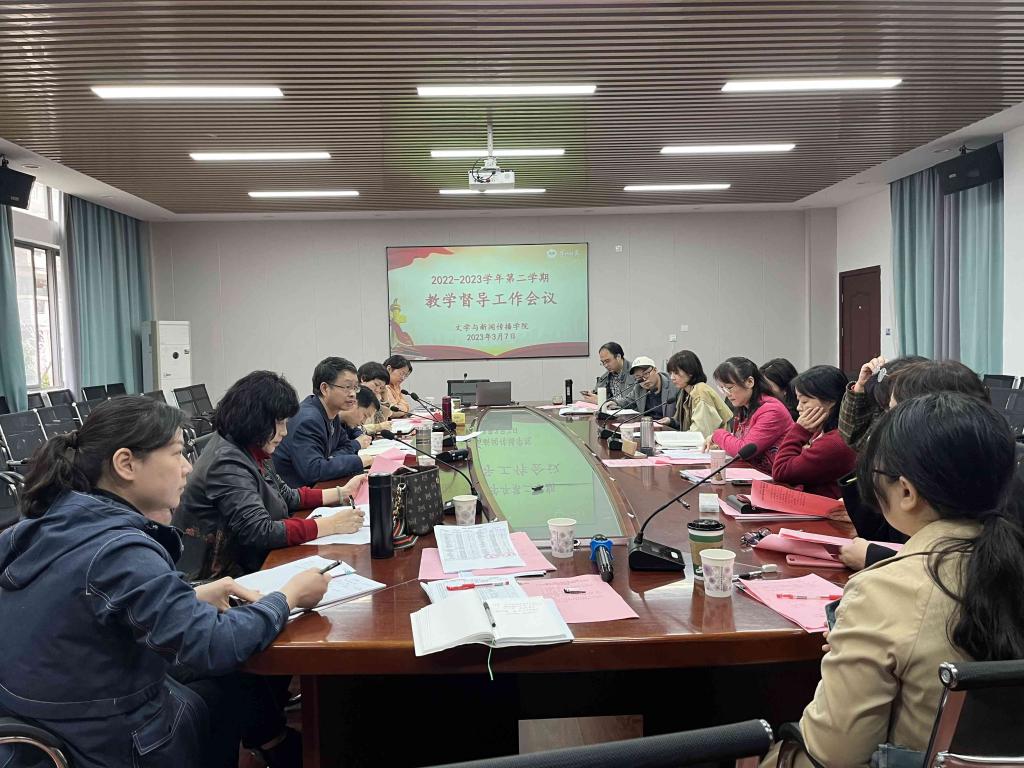 2022-2023学年第二学期教学督导工作会议在玉衡楼201汉语言文学专业研讨室召开,院长龙永干、副院长罗燕、副院长王霞及全体教学督导参加了会议。会议由罗燕主持。
