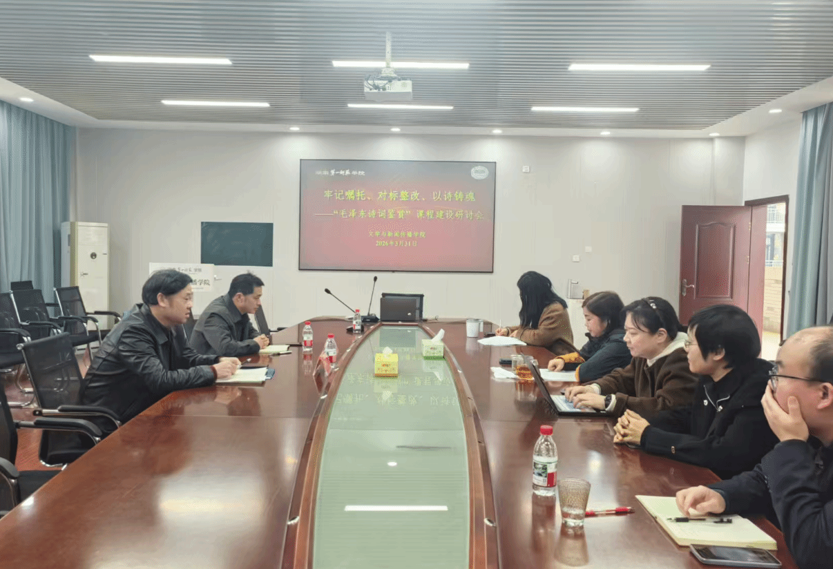 在玉衡楼201会议室召开《毛泽东诗词鉴赏》课程建设研讨会。院党委书记刘立勇、院长龙永干、副院长杨水远、张惠及课程组教师参会,聚焦课程思政提质、红色资源转化,全力推动这门红色课程向大思政金课转型,以课程建设实效检验巡视整改成果。