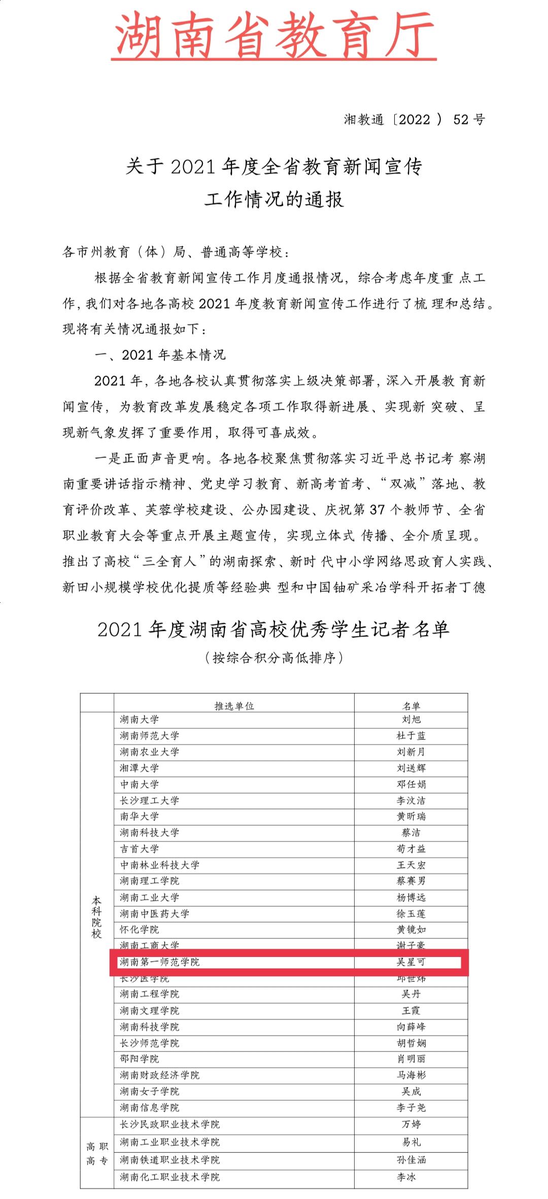 日前,经校党委宣传部的推荐,在湖南省教育厅发布的《关于2021年度全省教育新闻宣传工作情况的通报》中,暗网禁区 2019级800中文班吴星可获评“2021年度湖南省优秀学生记者”。