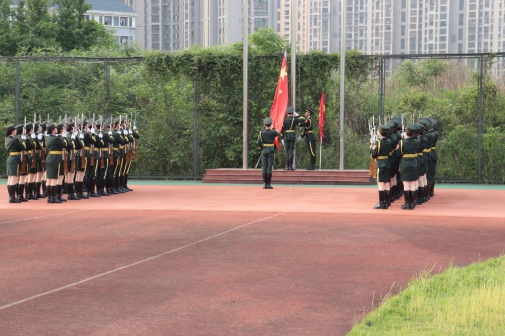 国旗护卫队迈着庄严而整齐的步伐走到旗台下。全体师生肃立,奏唱国歌,注视着五星红旗,伴着庄严嘹亮的国歌,五星红旗冉冉升起。