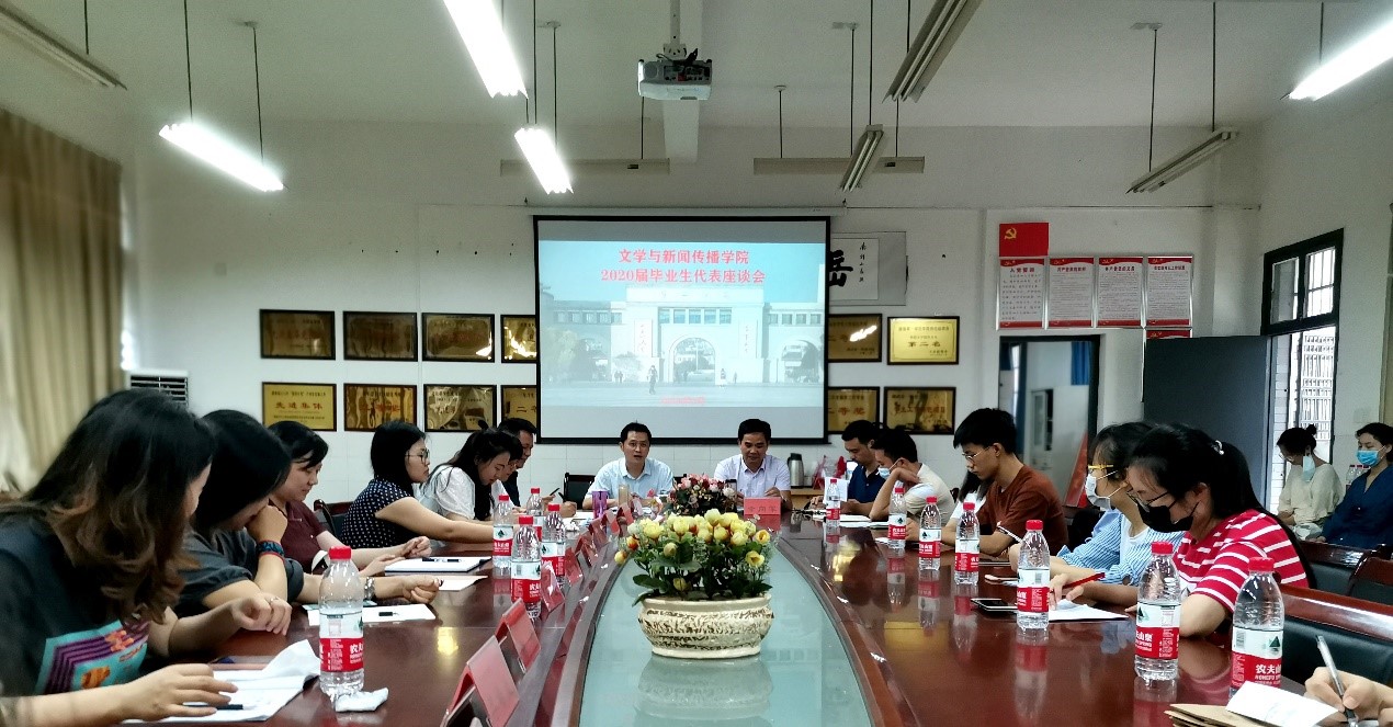 在玉衡楼201会议室召开2020届毕业生代表座谈会。学院党总支书记佘向军、院长龙永干、党总支副书记欧阳范剑、副院长葛春蕃、各科室主任、各教研室主任、毕业班辅导员和毕业生代表参加座谈会。