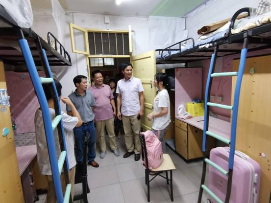 为了解新生的住宿情况,座谈会结束后,领导们一行人来到新生宿舍查看宿舍的整体环境和电器设备,询问新生的学习、生活情况,听取新生们对宿舍和生活服务设施所提出的意见,并对学生寝室环境卫生、寝室文化建设、寝室安全使用电器等方面提出了宝贵的建议。