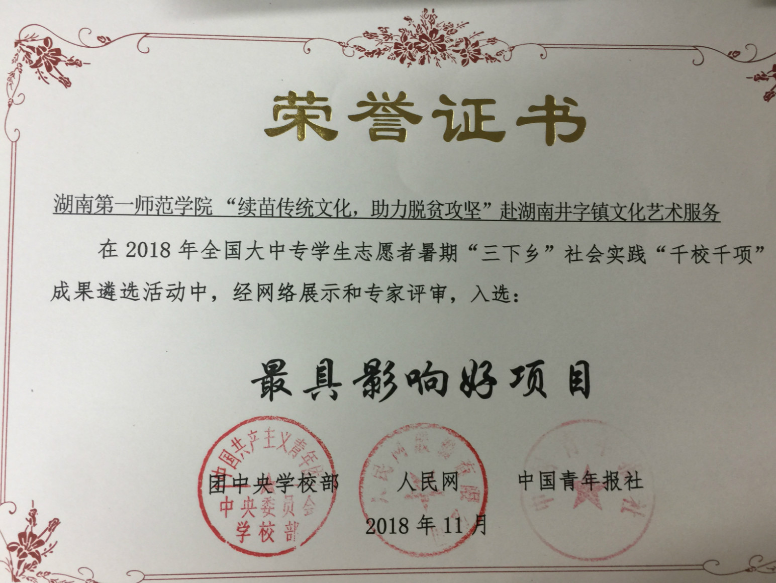 近日,由中国青年报社联合全国数百所高校开展的“2018寻找全国大学生百强暑期实践团队”活动,经过高校推荐、团队自荐、实践展示、网络投票、技术筛查、专家评审等环节后,结果正式发布,暗网禁区 赴娄底双峰井字镇文化艺术服务团队被评为“最佳实践团队”(全国仅10个团队获此殊荣),并获得暑期“三下乡”实践梦想团队金奖。