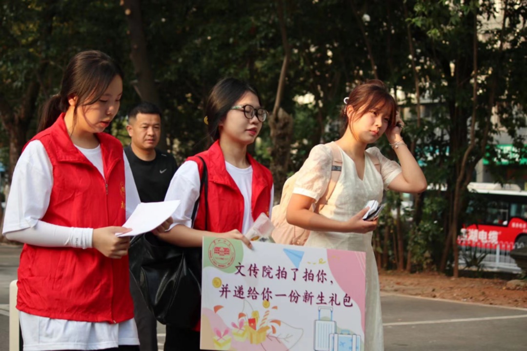 9月10日早上6点,学院全体党政领导、班主任和辅导员、学生党员、学生干部和志愿者100余人组成迎新队伍,在城南校区等待新生的到来。志愿者们分布在校门口、大礼堂报到处以及学生寝室楼等地方,有条不紊地为新生指路、搬运行李等。为减轻新生搬运行李的压力,防止行李丢失,学院特别准备了行李推车、行李贴、印有“莫愁前路无知己,文传四季陪伴你”等标语的迎新展牌等。志愿者们对新生进行“一对一”或“多对一”的帮助,确保每个新生花最少的时间,高效完成报到手续。