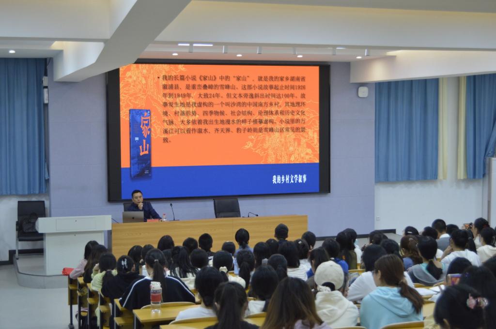 师生开展了题为“小说创作谈——以《家山》为例”的专题讲座。讲座由院长龙永干教授主持,副院长杨水远博士及300余名师生参加了这次活动。