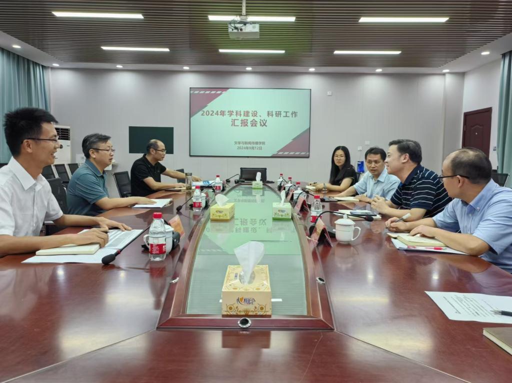 的师资队伍、科学研究、硕士学位点建设和规划情况及下阶段学院的重点工作进行了汇报。欧阳章东处长指出文传院在学位点建设上卓有成效,继续做好首届学科教学(语文)硕士研究生的招生工作,争取在2026年的学位点申报中取得更大的成绩。肖攀处长宣讲了学校新的科研政策,对文传院本年度的科研完成情况做了总结,希望文传院提前谋划,争取取得更大的成绩。