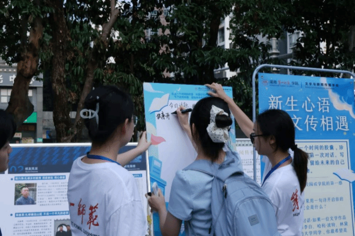在新生报到点旁边设立的“新声心语,文传相遇”心声征集展台,则给予了“新文传人”写下心中所想的机会。展台KT板上的问题充满乐趣:“这是一个时间的胶囊,珍藏你与大学的第一次对话”;“如果一位文学作品中的人物成为你的大学同学,你最希望是谁”;“如果用一句诗来开启你的大学四年,它会是哪一句”……新生可抽取主题卡片,写下对校园的初印象、此刻心情或对未来的期待。有趣的活动吸引了一大批同学跃跃欲试。25级中文4班张涵雅在卡片上工整写下“兴酣落笔摇五岳,诗成笑傲临沧州”,留下大学的第一份记忆。看到kt板上新生们密密麻麻的回答,龙永干院长也欣然提笔写下“读《论语》,品《庄子》,做文化传承人”的殷殷嘱托。展台旁还设有合影区,多款创意手持牌如“文名而来,传递精彩”等,帮助新生记录难忘瞬间。