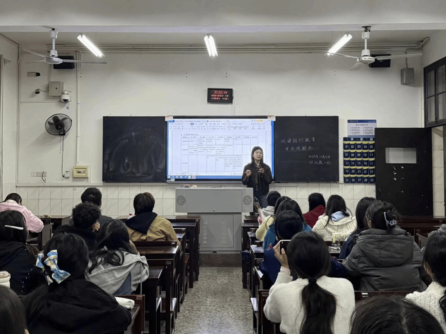 10月21日晚上7时,汉语国际教育专业介绍会在城南书院教学楼402教室举行,系主任孙雅平老师担任主讲。在课程设置方面,她详细介绍了分学期开设的汉语教学法、跨文化交际等核心课程,明晰 “学什么” 的专业培养路径;在师资力量上,重点介绍了教学团队中在汉语习得研究、文化教材开发领域成果显著的教师,展现 “谁来教” 的专业实力。此外,针对学生关切的就业方向,孙雅平老师详细梳理了国际汉语教师、跨文化传播专员等职业发展路径,为学生明晰了未来发展方向。