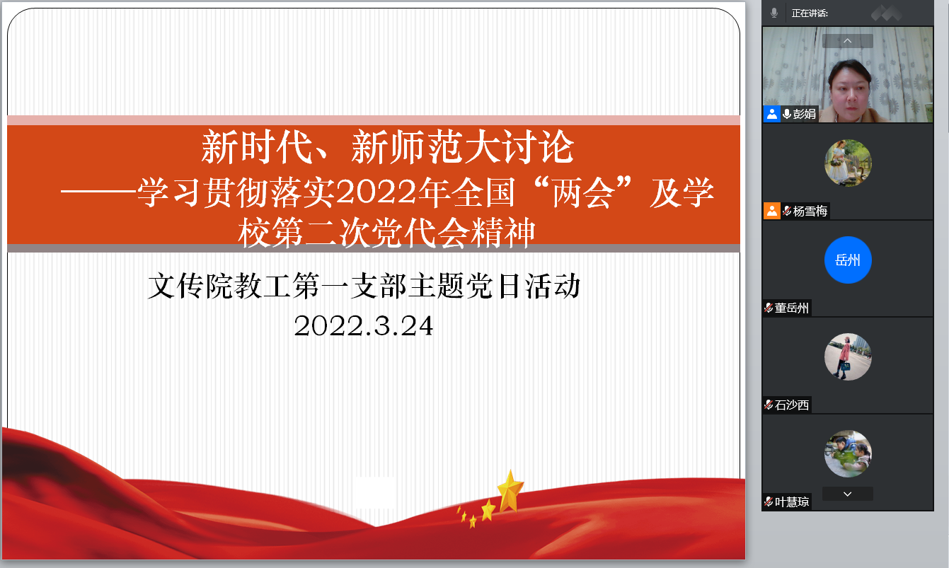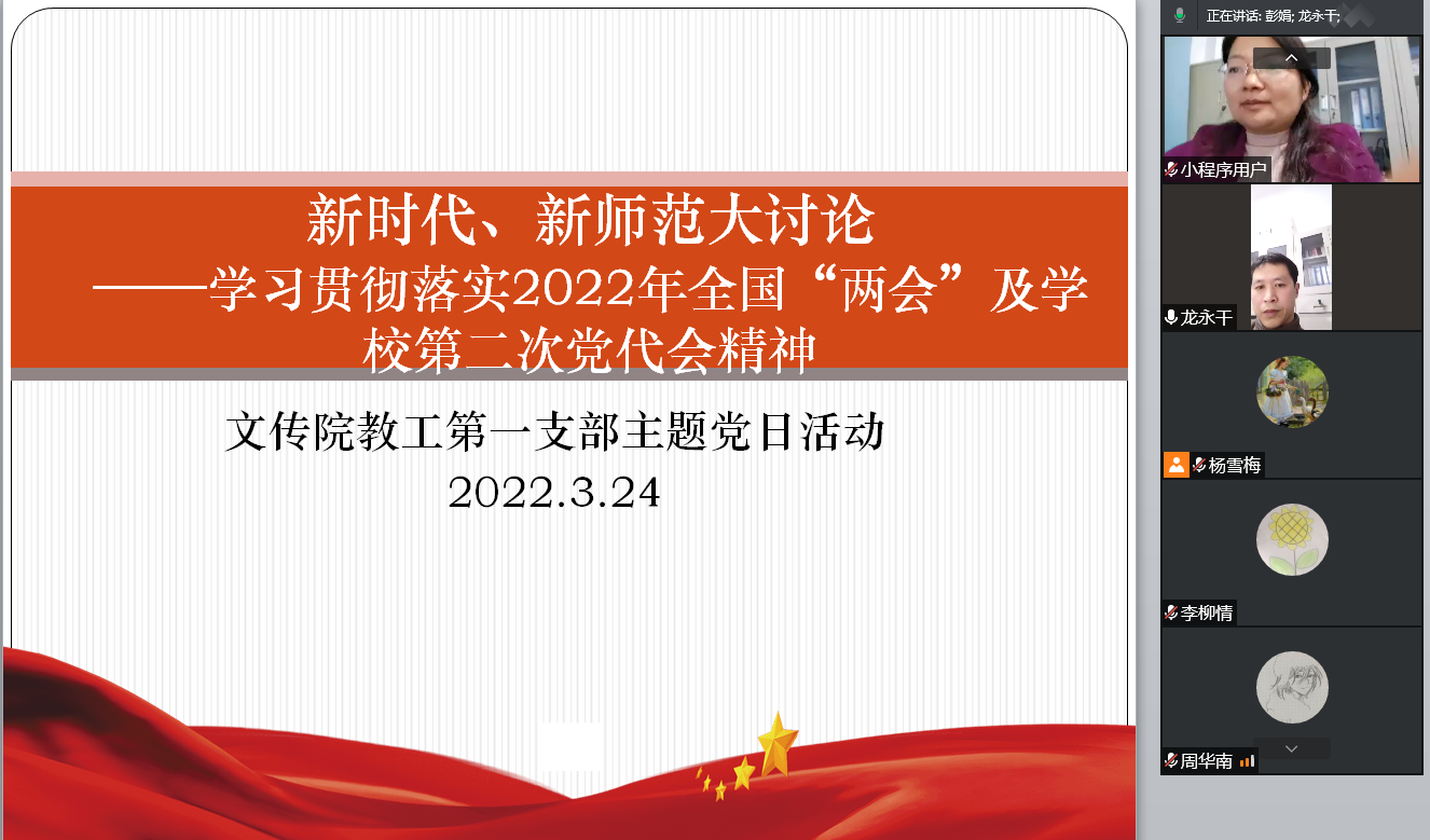 3月24日晚,因疫情防控需要,教工一支部支委以线上会议的方式组织了3月主题党日活动,此次活动围绕“新时代、新师范大讨论”——学习贯彻落实2022年全国“两会”及学校第二次党代会精神而展开。全体党员老师参加了此次活动,活动由支部书记彭娟主持。
